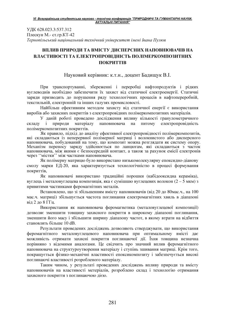 | Bibliographic description: | Pleskun M. (2013) Vplyv pryrody ta vmistu dyspersnykh napovniuvachiv na vlastyvosti ta elektroprovidnist polimerkompozytnykh pokryttiv. Materials of Ⅵ the All-Ukrainian Student Science Conference "Natural and Human Sciences. Current issues." (Tern., 25-26 March 2013), Volume 1, pp. 281 [in Ukrainian]. |