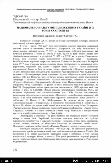 | Bibliographic description: | Kindzerska N. (2010) Natsionalno-kulturne pidnesennia v Ukraini 20-kh rokiv KhKh stolittia. Materials of Ⅲ Ukrainian Student Science Conference "Natural and Human Sciences. Actual issues" (Tern., 22-23 April 2010), Volume 1, pp. 382 [in Ukrainian]. |