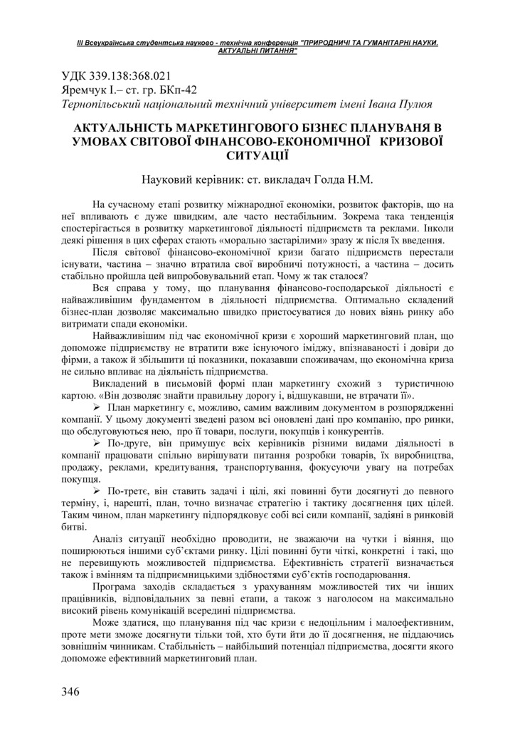 | Назва: | Актуальність маркетингового бізнес плануваня в умовах світової фінансово-економічної кризової ситуації |