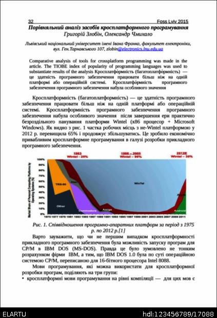 | Bibliographic description (Ukraine): | Злобін Г. Г. Порівняльний аналіз засобів кросплатформного програмування / Злобін Григорій Григорович, Чмихало Олександр Сергійович // FOSS Lviv 2015, 23-26 квітня 2015 року — Л., 2015 — С. 32-39. |