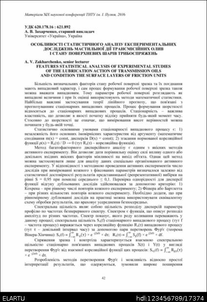 | Título : | Особливості статистичного аналізу експериментальних досліджень мастильної дії трансмісійних олив і стану поверхневих шарів трибоспряжень |