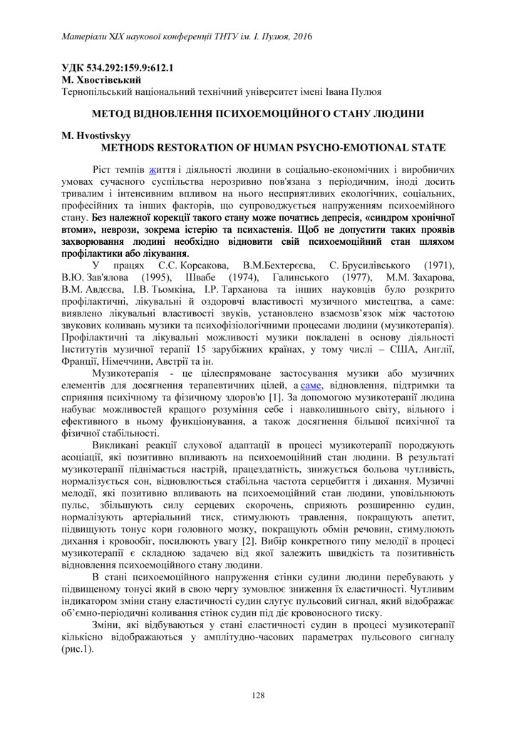 | References (International): | 1. Muzykaterapiia, Psikhoterapevticheskaia entsiklopediia; Pod. red. B.D. Karvasarskoho, SPb: "Piter", 2000, P.392 – 394. 2. Blavo R. Muzyka i zdorove, Blavo R, SPB:Dilia, 2002, 288 p. 3. Khvostivska L.V. Syntez struktury informatsiinoi systemy reiestratsii ta obrobky pulsovoho syhnalu, M.O. Khvostivskyi, L.V.Khvostivska, Naukovyi visnyk Chernivetskoho universytetu: zbirnyk nauk. prats. Fizyka. Elektronika, V. 4, Iss. 1, Chernivtsi: Chernivetskyi natsionalnyi universytet, 2015, P. 83-89, ISSN 2227-8842 |