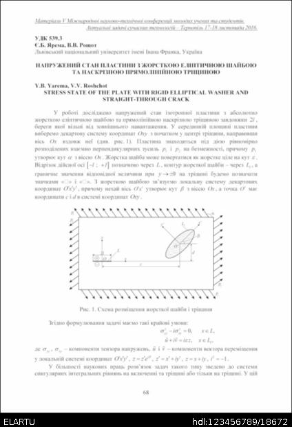 | Bibliographic description (International): | Yarema Y. B., Roshchot V. V. (2016) Napruzhenyi stan plastyny z zhorstkoiu eliptychnoiu shaiboiu ta naskriznoiu priamoliniinoiu trishchynoiu [Stress state of the plate with rigid elliptical washer and straight-through crack]. Book of abstract the Ⅴ International scientific and technical conference of young researchers and students "Current issues in modern technologies" (Tern., 17-18 November 2016), vol. I, pp. 68-69 [in Ukrainian]. |