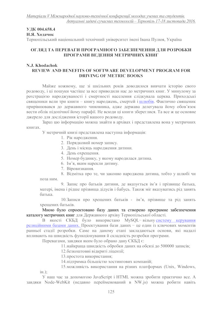 | Bibliographic description (International): | Khodachok N. J. (2016) Ohliad ta perevahi prohramnoho zabezpechennia dlia rozrobki prohrami vedennia metrichnikh knih [Review and benefits of software development program for driving of metric books]. Book of abstract the Ⅴ International scientific and technical conference of young researchers and students "Current issues in modern technologies" (Tern., 17-18 November 2016), vol. Ⅱ, pp. 125-126 [in Ukrainian]. |
