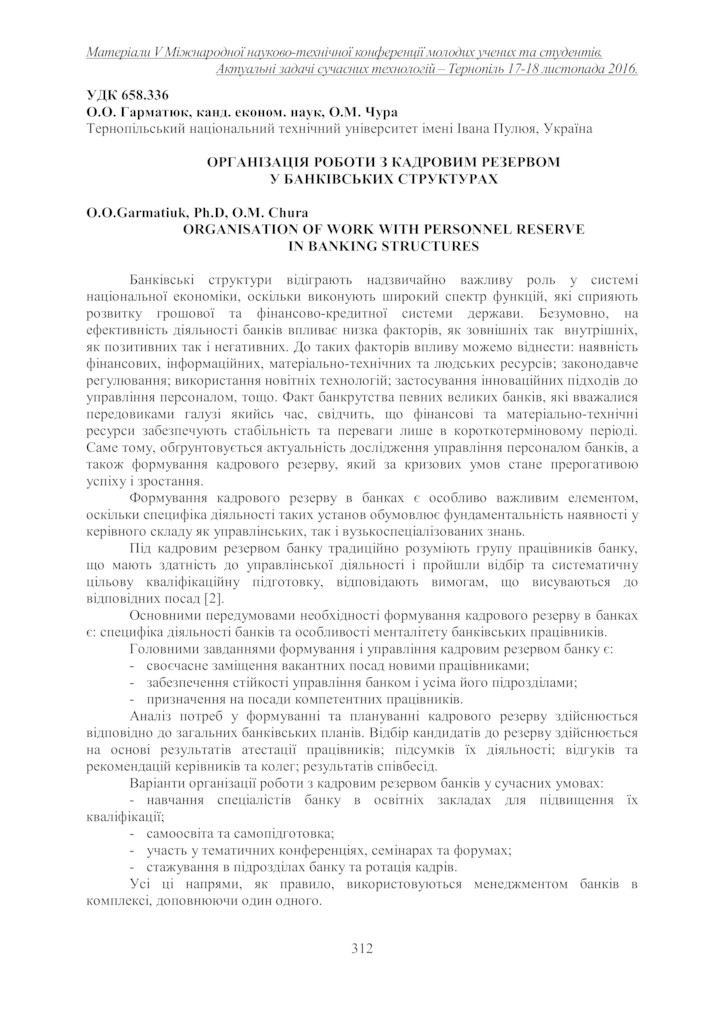 | Bibliographic description: | Garmatiuk O. O., Chura O. M. (2016) Orhanizatsiia roboty z kadrovym rezervom u bankivskykh strukturakh [Organisation of work with personnel reserve in banking structures]. Book of abstract the Ⅴ International scientific and technical conference of young researchers and students "Current issues in modern technologies" (Tern., 17-18 November 2016), vol. Ⅱ, pp. 312-313 [in Ukrainian]. |