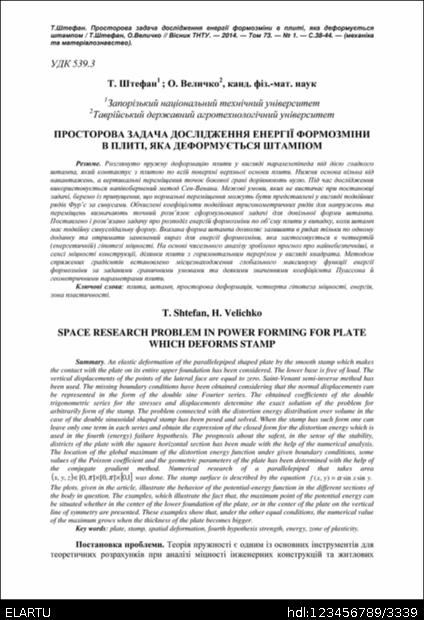 | Title: | Просторова задача дослідження енергії формозміни в плиті, яка деформується штампом |
