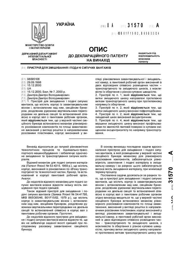 | Bibliographic description (Ukraine): | Патент 31570 UA, МПК B65G 33/24, B01F 15/02. Пристрій для змішування і подачі сипучих вантажів [Текст] / Дмитрів Дмитро Володимирович (Україна) - опубл. 15.12.2000. Patent 31570 UA, MPK B65G 33/24, B01F 15/02. Device for mixing and supply of bulk cargo [Text] / Dmytriv Dmytro Volodymyrovych (Ukraine) - publ. 15.12.2000. Патент 31570 UA, МПК B65G 33/24, B01F 15/02. Устройство для смешивания и подачи сыпучих грузов [Текст] / Дмытрив Дмитрий Владимирович (Украина) - опубл. 15.12.2000. |