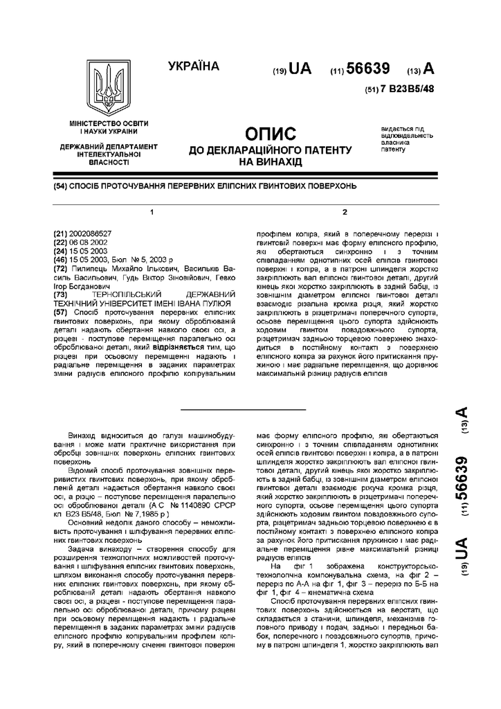 | Bibliographic description (Ukraine): | Патент 56639 UA, МПК B23B 5/00. Спосіб проточування перервних еліпсних гвинтових поверхонь [Текст] / Пилипець Михайло Ількович, Васильків Василь Васильович, Гевко Ігор Богданович, Гудь Віктор Зіновійович (Україна) - опубл. 15.05.2003. Patent 56639 UA, MPK B23B 5/00. Method for gnowing-through irregular eliptical screw surfaces [Text] / Pylypets Mykhailo Ilkovych, Vasylkiv Vasyl Vasyliovych, Hevko Ihor Bohdanovych (Ukraine) - publ. 15.05.2003. Патент 56639 UA, МПК B23B 5/00. Способ проточки прерывистых элипсных винтовых поверхностей [Текст] / Пилипец Михаил Илькович, Василькив Василий Васильевич, Гевко Игорь Богданович (Украина) - опубл. 15.05.2003. |