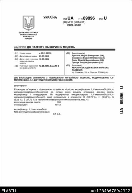 | Bibliographic description (Ukraine): | Патент 89896 UA, МПК C08L 63/00. Епоксидне зв’язуюче з підвищеною когезійною міцністю, модифіковане 1,1′-метиленбіс(4-n,n-діетилдитіокарбаматобензолом) [Текст] / Яцюк Віталій Миколайович, Букетов Андрій Вікторович, Грищук Богдан Дмитрович, Скирденко Вадим Олегович (Україна) - опубл. 12.05.2014. |