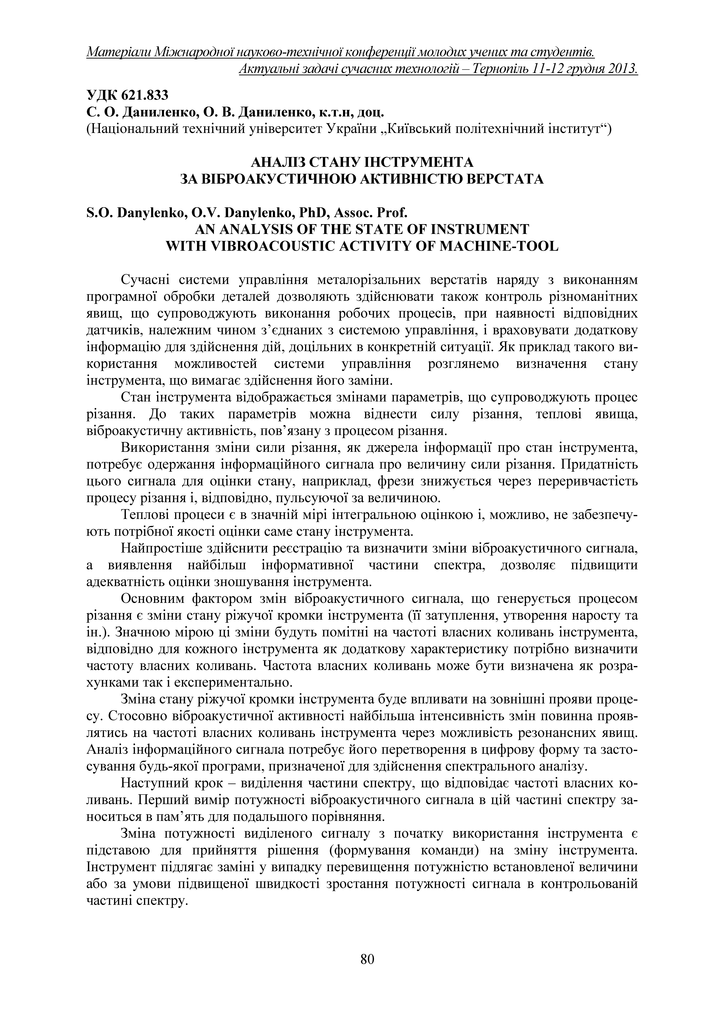 | Інші назви: | An analysis of the state of instrument with vibroacoustic activity of machine-tool |
