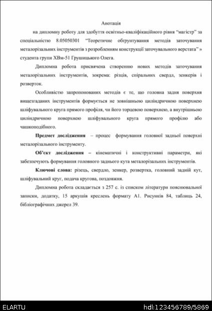 | Бібліографічний опис: | Грушицький О. Теоретичне обґрунтування методів заточування металорізальних інструментів з розробленням конструкції заточувального верстата : дипломна робота магістра за спеціальністю „8.05050301 — металорізальні верстати та системи“/ О. Грушицький ; Тернопільський національний технічний університет імені Івана Пулюя. — Тернопіль: ТНТУ, 2015. — 257 с. |