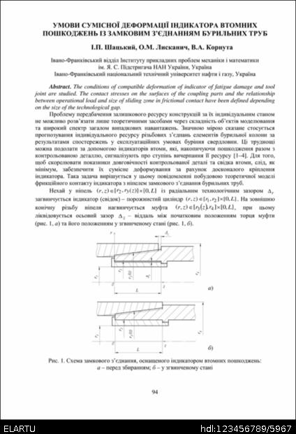 | Назва: | Умови сумісної деформації індикатора втомних пошкоджень із замковим з’єднанням бурильних труб |