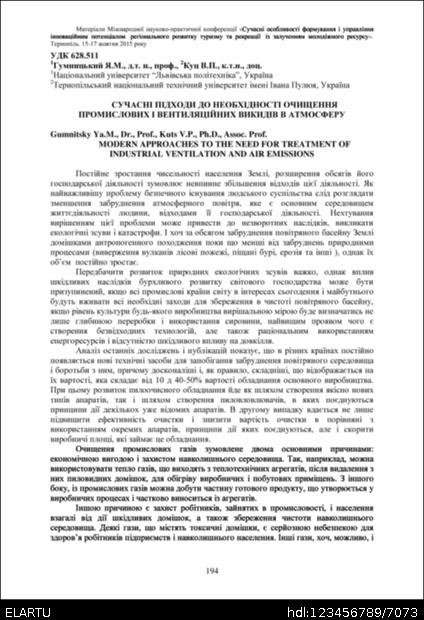 | Bibliographic description: | Gumnitsky Ya. M., Kuts V. P. (2015) Suchasni pidkhody do neobkhidnosti ochyshchennia promyslovykh i ventyliatsiinykh vykydiv v atmosferu [Modern approaches to the need for treatment of industrial ventilation and air emissions]. Proceedings of the international scientific-practical conference "Modern peculiarities of the innovation resource creation and management for the regional tourism and recreation development with youth resource involvement" (Tern., 15-17 october 2015), pp. 194-196 [in Ukrainian]. |