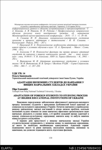 | Bibliographic description: | Ivanonkiv O. (2014) Adaptatsiia inozemnykh studentiv do navchannia u vyshchykh navchalnykh zakladakh Ukrainy [Adaptation of foreign students to studying process at higher educational institutions of Ukraine]. Proceedings of the International scientific conference "Actual Problems in International Students Teaching and Learning within European Higher Education Area" (Tern., 13-16 May 2014), pp. 130-133 [in Ukrainian]. |