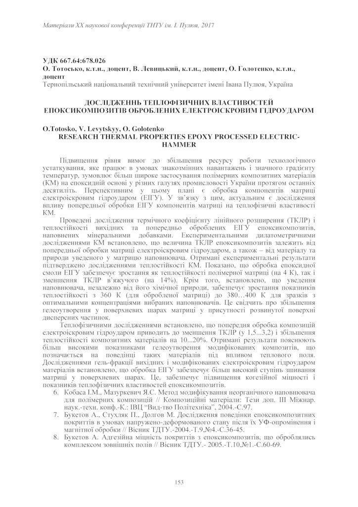 | Bibliographic description: | Totosko O., Levytskyy V., Golotenko O. (2017) Doslidzhenn teplofizychnykh vlastyvostei epoksykompozytiv obroblenykh elektroiskrovym hidroudarom [Research thermal properties epoxy processed electric-hammer]. Materials of ⅩⅩ Conference TNTU I. Pul'uj (Tern., 17-18 May 2017), pp. 153 [in Ukrainian]. |