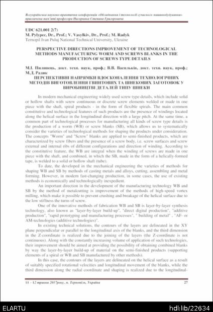 | Інші назви: | Perspective directions improvement of technological methods manufacturing worm and screws blanks in the production of screws type details |