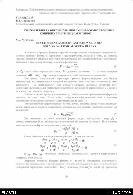 | Bibliographic description (Ukraine): | Сироватко В. В. Розроблення та обгрунтування схеми формоутворення конічних гвинтових заготовок / В. В. Сироватко // Збірник тез доповідей Ⅵ Міжнародної науково-технічної конференції молодих учених та студентів „Актуальні задачі сучасних технологій“, 16-17 листопада 2017 року. — Т. : ТНТУ, 2017. — Том Ⅰ. — С. 164–165. — (Сучасні технології в будівництві, машино- та приладобудуванні). |
