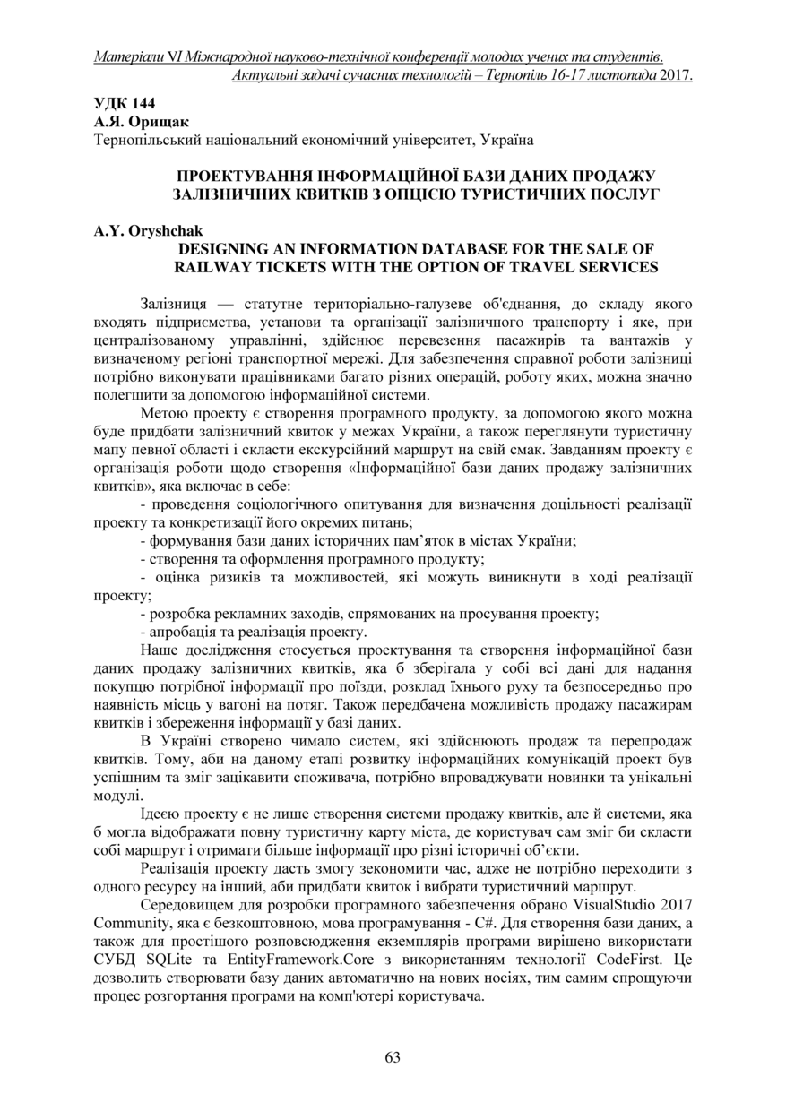 | Bibliographic description: | Oryshchak A. Y. (2017) Proektuvannia informatsiinoi bazy danykh prodazhu zaliznychnykh kvytkiv z optsiieiu turystychnykh posluh [Designing an information database for the sale of railway tickets with the option of travel services]. Book of abstract the Ⅵ International scientific and technical conference of young researchers and students "Current issues in modern technologies" (Tern., 16-17 November 2017), vol. 3, pp. 63-64 [in Ukrainian]. |