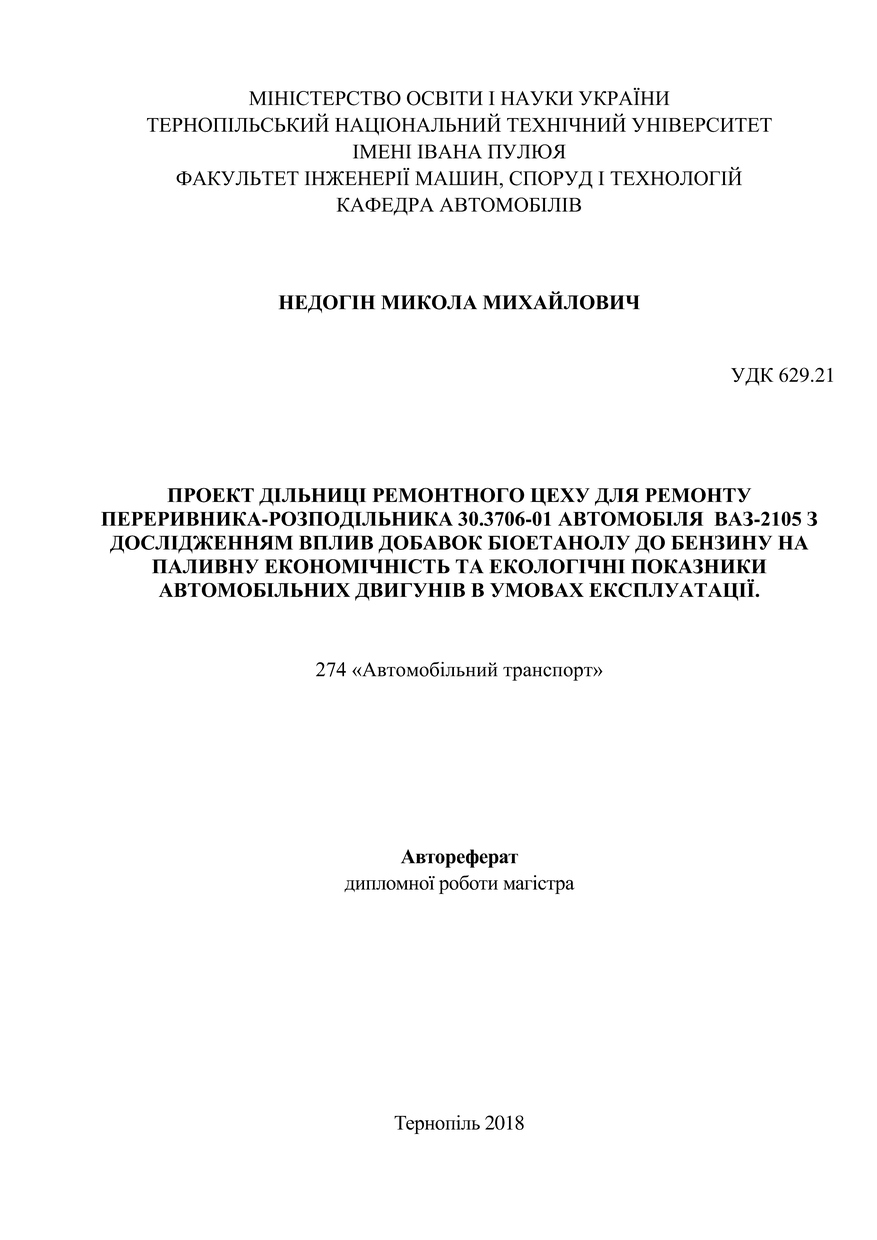 | Назва: | Проект дільниці ремонтного цеху для ремонту переривника-розподільника 30.3706-01 автомобіля ВАЗ-2105 з дослідженням вплив добавок біоетанолу до бензину на паливну економічність та екологічні показники автомобільних двигунів в умовах експлуатації |