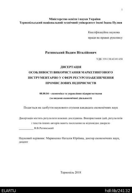 Бібліографічний опис: Ратинський В.В. Особливості використання маркетингового інструментарію у сфері ресурсозабезпечення промислових підприємств [Текст] : автореф. дис... канд. екон. наук : 08.00.04 / ТНТУ ім. І.Пулюя. — Тернопіль, 2018. — 20с.