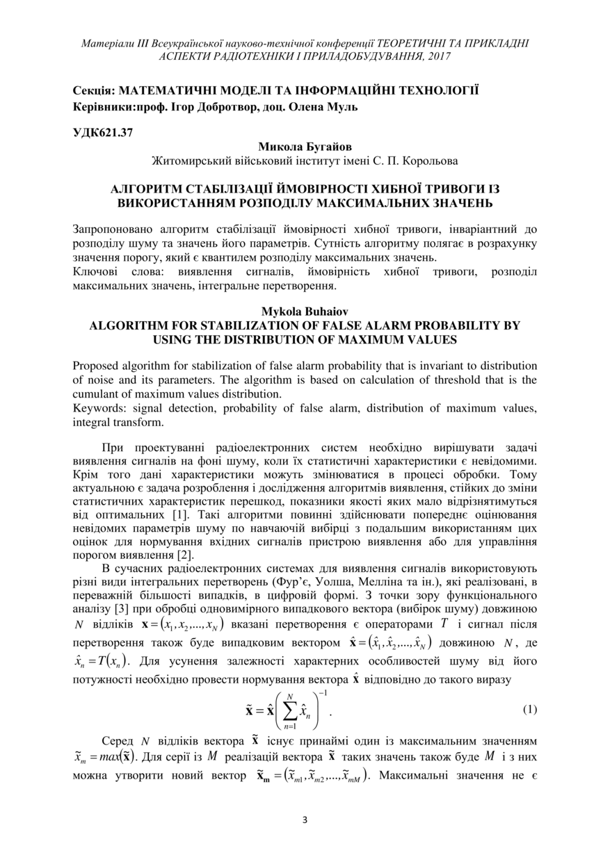 | Bibliographic description (International): | Buhaiov M. (2017) Alhorytm stabilizatsii ymovirnosti khybnoi tryvohy iz vykorystanniam rozpodilu maksymalnykh znachen [Algorithm for stabilization of false alarm probability by using the distribution of maximum values]. Materials of the Ⅲ All-Ukrainian Scientific and Technical Conference "Theoretical and Applied Aspects of Radio Engineering and Instrumentation" (Tern., 8-9 June 2017), pp. 3-4 [in Ukrainian]. |