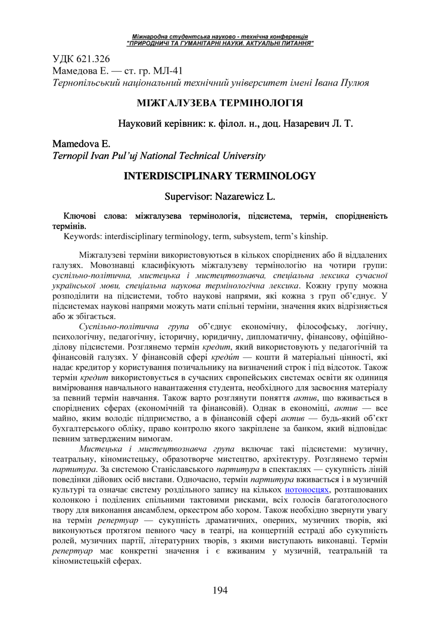 | Bibliographic description (International): | Mamedova E. (2018) Mizhhaluzeva terminolohiia [Interdisciplinary terminology]. Zbirnyk tez Mizhnarodnoi studentskoi naukovo-tekhnichnoi konferentsii "Pryrodnychi ta humanitarni nauky. Aktualni pytannia" (Tern., 26-27 April 2018), vol. 2, pp. 194-195 [in Ukrainian]. |