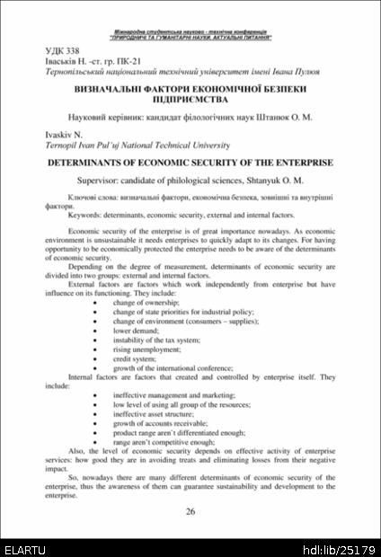 | Sonstige Titel: | Визначальні фактори економічної безпеки підприємства |