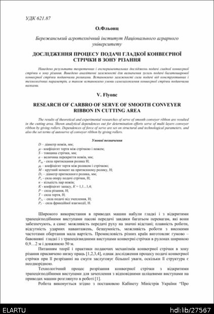 | Інші назви: | Research of carbro of serve of smooth conveyer ribbon in cutting area |