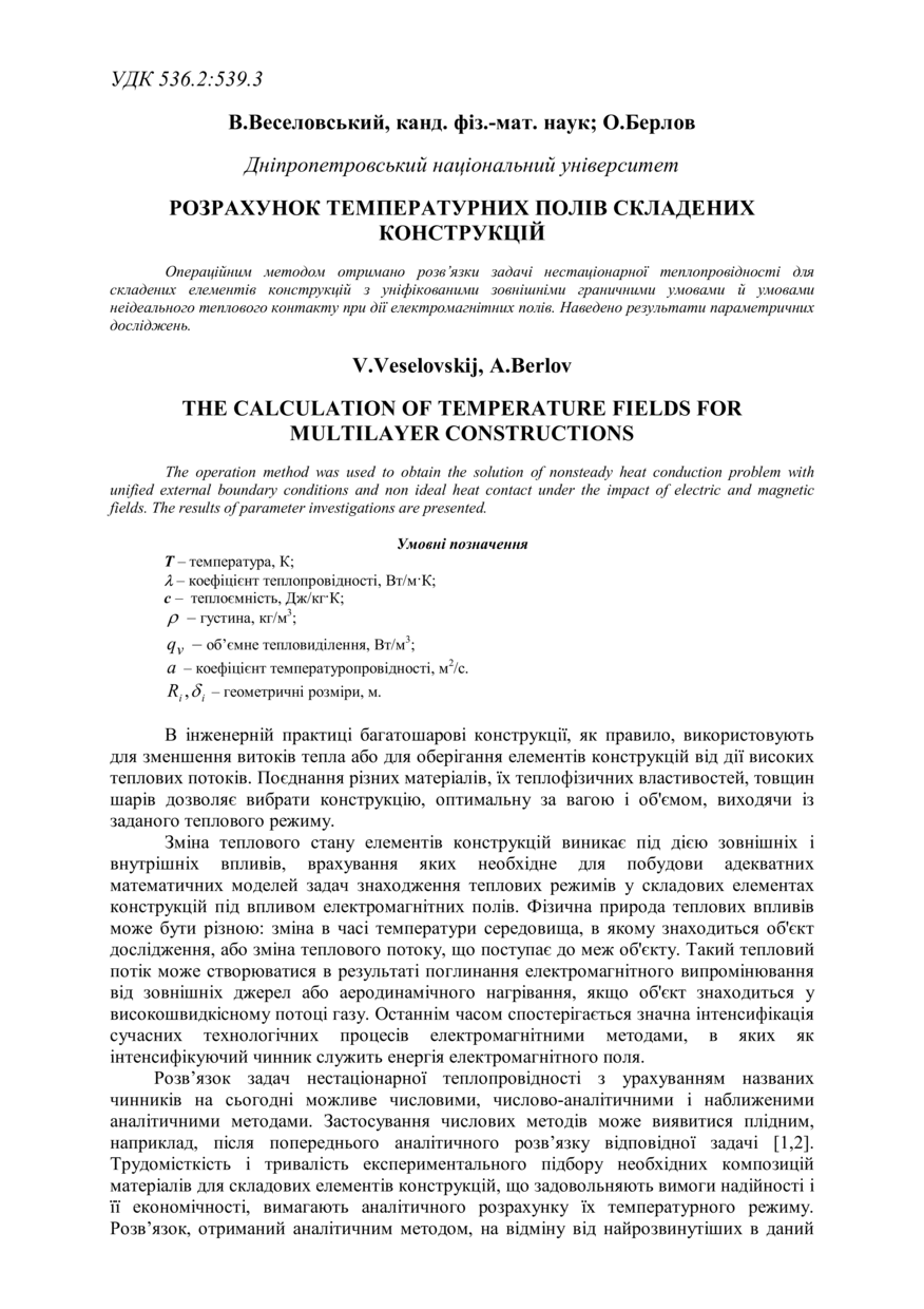 | References (International): | 1. Kudinov V. A., Kartashov E. M., Kalashnikov V. V. Analiticheskie resheniia zadach teplomassoperenosa i termoupruhosti dlia mnohosloinykh konstruktsii, M., Vyssh. shk., 2005, 430p. 2. Samarskii A. A., Vabishchevich P. N. Vychislitelnaia teploperedacha, M., Editorial, 2003, 784 p. 3. Veselovskii V. B. Reshenie zadach nestatsionarnoi teploprovodnosti dlia mnohosloinykh ploskikh tel s neidealnym teplovym kontaktom, Prikladnye voprosy aerodinamiki letatelnykh apparatov, Kiev: Nauk. dumka, 1984, P.140 – 144. 4. Veselovskii V. B. Matematicheskoe modelirovanie vliianiia polei razlichnoi fizicheskoi prirody na teplovye rezhimy elementov konstruktsii, Tekhnicheskaia mekhanika, 1993, Iss.1, P.114 – 117. 5. Veselovskii V. B. Sravnenie metodov resheniia nelineinykh zadach nestatsionarnoi teploprovodnosti dlia sterzhnia, Tekhnicheskaia mekhanika, 1999, №.1, P.99 – 111. 6. Berlov A. V. Reshenie strukturnym metodom zadach teploprovodnosti dlia sostavnykh elementov konstruktsii pri vozdeistvii elektromahnitnykh polei, Diferentsialni rivniannia ta Yikh zastosuvannia: Zb. nauk. pr. DNU, D., 2006, P.70 – 79. 7. Beliaev N. M., Riadno A. A. Metody nestatsionarnoi teploprovodnosti, M., Vyssh. shk., 1978, 328c. 8. Bondarenko P. N., Emelianov O. A. Eksperimentalnoe izuchenie tokovoho razrusheniia metallizirovannykh polimernykh plenok, Pisma v ZhTF, 2005, V.31, Iss.14, P.67-72. 9. Keller R., Greiss R., Cheng Y. E. Electric current induced thermomechanical fatigue testing of interconnects, Characterization and Metrology for ULSI Technology. 2005, AIP Conference Proc., V.788, p.491-495. |