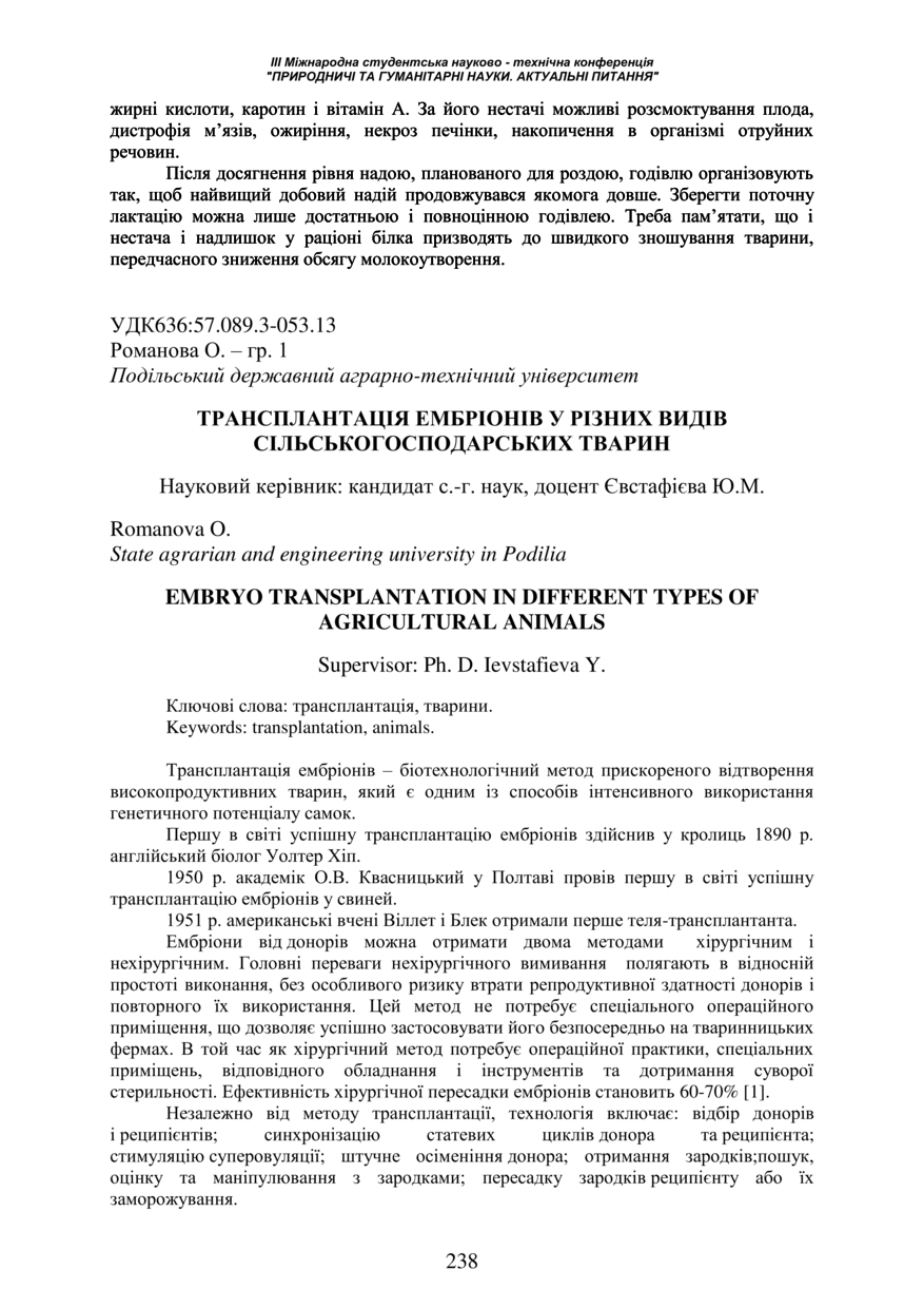 | Bibliographic description: | Romanova O. (2020) Transplantatsiia embrioniv u riznykh vydiv silskohospodarskykh tvaryn [Embryo transplantation in different types of agricultural animals]. Materialy Ⅲ Mizhnarodnoi studentskoi naukovo-tekhnichnoi konferentsii "Pryrodnychi ta humanitarni nauky. Aktualni pytannia" (Tern., 23-25 April 2020), pp. 238-239 [in Ukrainian]. |
