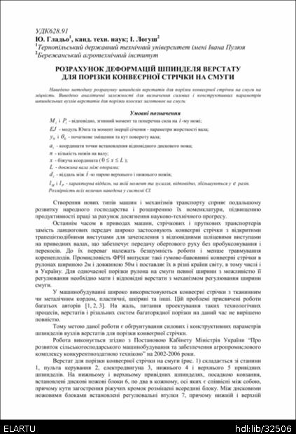 | Bibliographic description (International): | Hlado Yu. B., Lohush I. (2006) Rozrakhunok deformatsii shpyndelia verstatu dlia porizky konveiernoi strichky na smuhy. Scientific Journal of TSTU, vol. 11, no 1, pp. 60-66 [in Ukrainian]. |