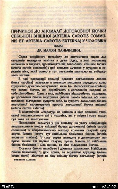 | Bibliographic description (International): | Pančysyn M. (1925) Beitrag zur Anomalie der Arteria carotis com munis et arteria carotis externa beim Menschen. Sammelschrift der mathematisch-naturwissenscraftlich-arztlichen sektion (Lviv), vol. XXIII-XXIV, pp. 35-41 [in Ukrainian]. |