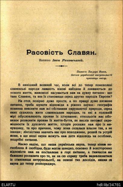 | Bibliographic description (International): | Rakovśkyj I. (1919) Rassenslawen. Sammelschrift der mathematisch-naturwissenscraftlich-arztlichen sektion (Lviv), vol. ⅩⅧ-ⅩⅨ, pp. 163-296 [in Ukrainian]. |