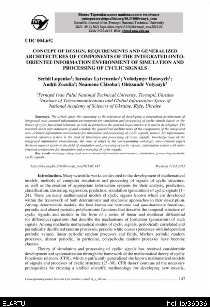 | Назва: | Concept of design, requirements and generalized architectures of components of the integrated onto-oriented information environment of simulation and processing of cyclic signals |