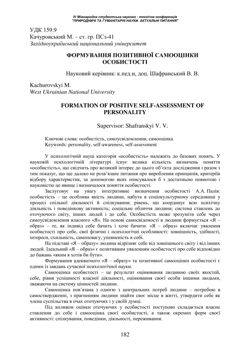 | Bibliographic description (International): | Kachurovskyi M. (2021) Formuvannia pozytyvnoi samootsinky osobystosti [Formation of positive self-assessment of personality]. Materialy Ⅳ Mizhnarodnoi studentskoi naukovo-tekhnichnoi konferentsii "Pryrodnychi ta humanitarni nauky. Aktualni pytannia" (Tern., 28-29 April 2021), pp. 182 [in Ukrainian]. |