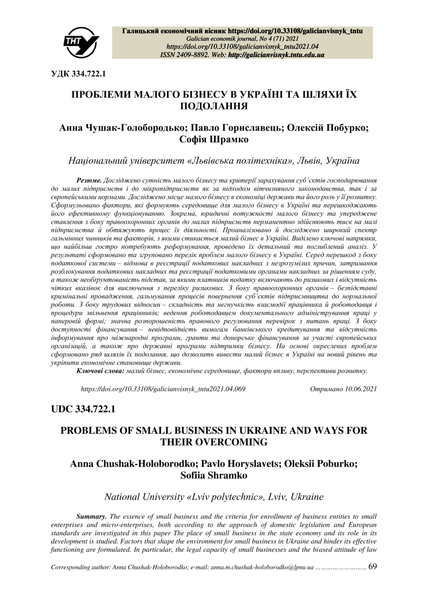 | Bibliographic description: | Chushak-Holoborodko A., Horyslavets P., Poburko O., Shramko S. (2021) Analiz i prohnozuvannia finansovoi stiikosti pidpryiemstva [Problems of small business in Ukraine and ways for their overcoming]. Galician economic journal (Tern.), vol. 71, no 4, pp. 69-76 [in Ukrainian]. |