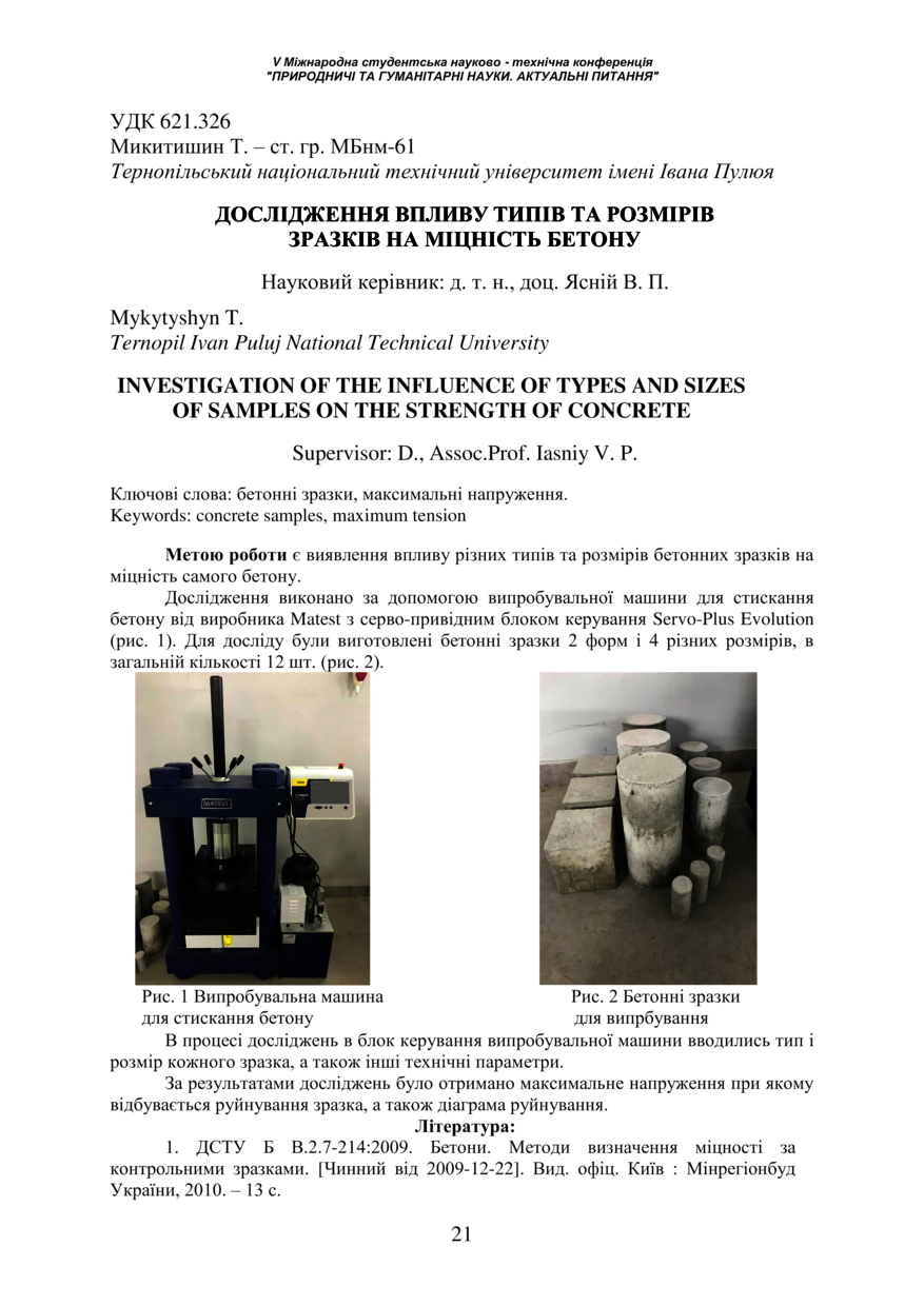 | Bibliographic description (International): | Mykytyshyn T., Iasniy V. P. (2022) Doslidzhennia vplyvu typiv ta rozmiriv zrazkiv na mitsnist betonu [Investigation of the influence of types and sizes of samples on the strength of concrete]. Proceedings of the Ⅴ International Student Scientific and Technical Conference "Natural Sciences and Humanities. Current Issues" (Tern., 28-29 April 2022), pp. 21 [in Ukrainian]. |