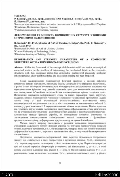 | Teitl: | Деформування та міцність композитних структур з тонкими стрічковими включеннями |