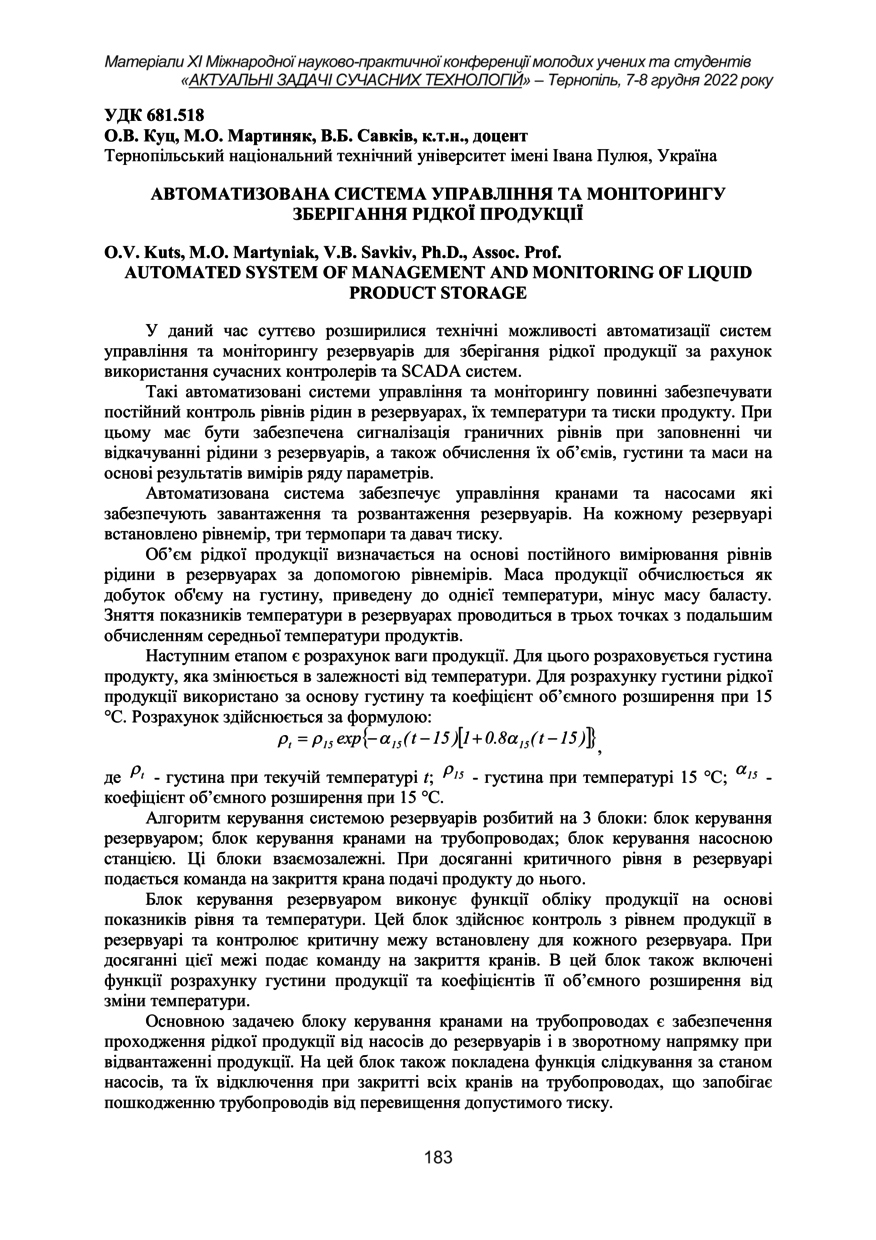 | Bibliographic description (International): | Kuts O. V., Martyniak M. O., Savkiv V. B. (2022) Avtomatyzovana systema upravlinnia ta monitorynhu zberihannia ridkoi produktsii [Automated system of management and monitoring of liquid product storage]. ⅩⅠ International scientific and practical conference of young researchers and students „Current issues in modern technologies“ (Tern., 7-8 December 2022), pp. 183 [in Ukrainian]. |