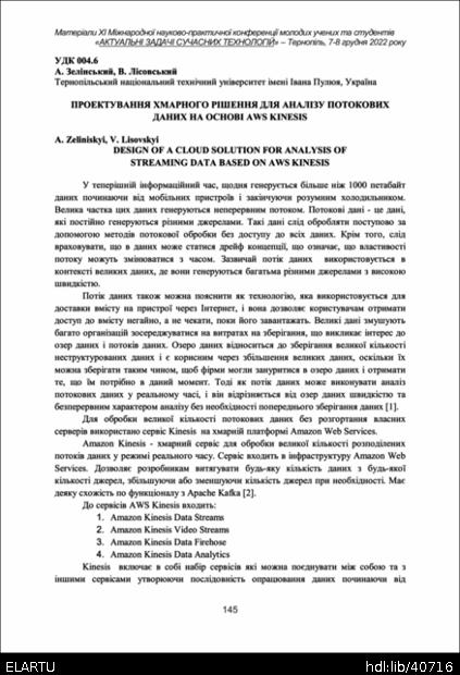 | Bibliographic description (International): | Zeliniskyi A., Lisovskyi V. (2022) Proektuvannia khmarnoho rishennia dlia analizu potokovykh danykh na osnovi AWS Kinesis [Design of a cloud solution for analysis of streaming data based on AWS Kinesis]. ⅩⅠ International scientific and practical conference of young researchers and students „Current issues in modern technologies“ (Tern., 7-8 December 2022), pp. 145-146 [in Ukrainian]. |