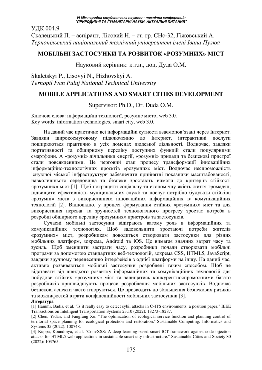 | Бібліографічний опис: | Скалецький П. Мобільні застосунки та розвиток «розумних» міст / Скалецький П., Лісовий Н., Гіжовський А. // Ⅵ Міжнародна студентська науково-технічна конференція „Природничі та гуманітарні науки. Актуальні питання“, 27-28 квітня 2023. — Т. : ТНТУ, 2023. — С. 175. — (Інформаційні технології). |