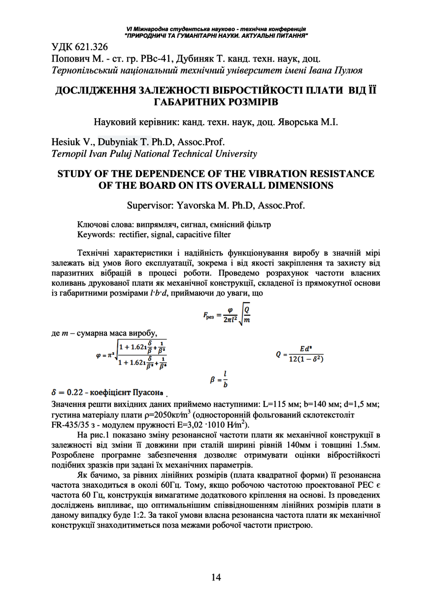 | Bibliographic description (International): | Hesiuk V., Dubyniak T. (2023) Doslidzhennia zalezhnosti vibrostiikosti platy vid yii habarytnykh rozmiriv [Study of the dependence of the vibration resistance of the board on its overall dimensions]. Ⅵ International Student Scientific and Technical Conference "Natural Sciences and Humanities. Topical issues" (Tern., 27-28 April 2023), pp. 14-15 [in Ukrainian]. |