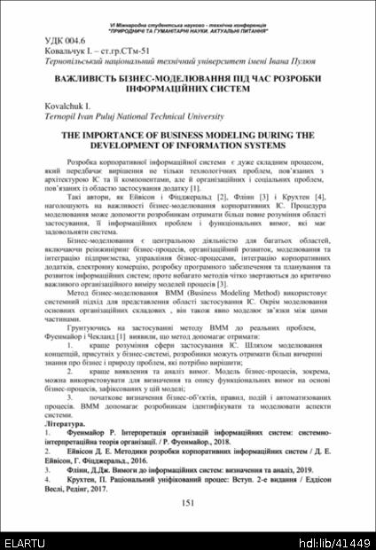 | Bibliographic description: | Kovalchuk I. (2023) Vazhlyvist biznes-modeliuvannia pid chas rozrobky informatsiinykh system [The importance of business modeling during the development of information systems]. Ⅵ International Student Scientific and Technical Conference "Natural Sciences and Humanities. Topical issues" (Tern., 27-28 April 2023), pp. 151 [in Ukrainian]. |