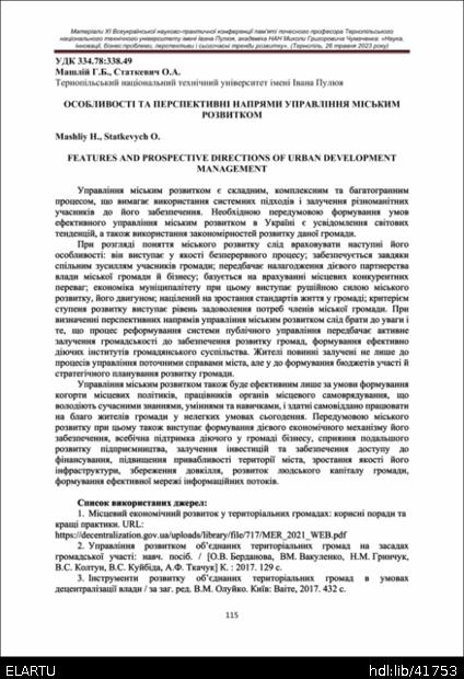 | Назва: | Особливості та перспективні напрями управління міським розвитком |