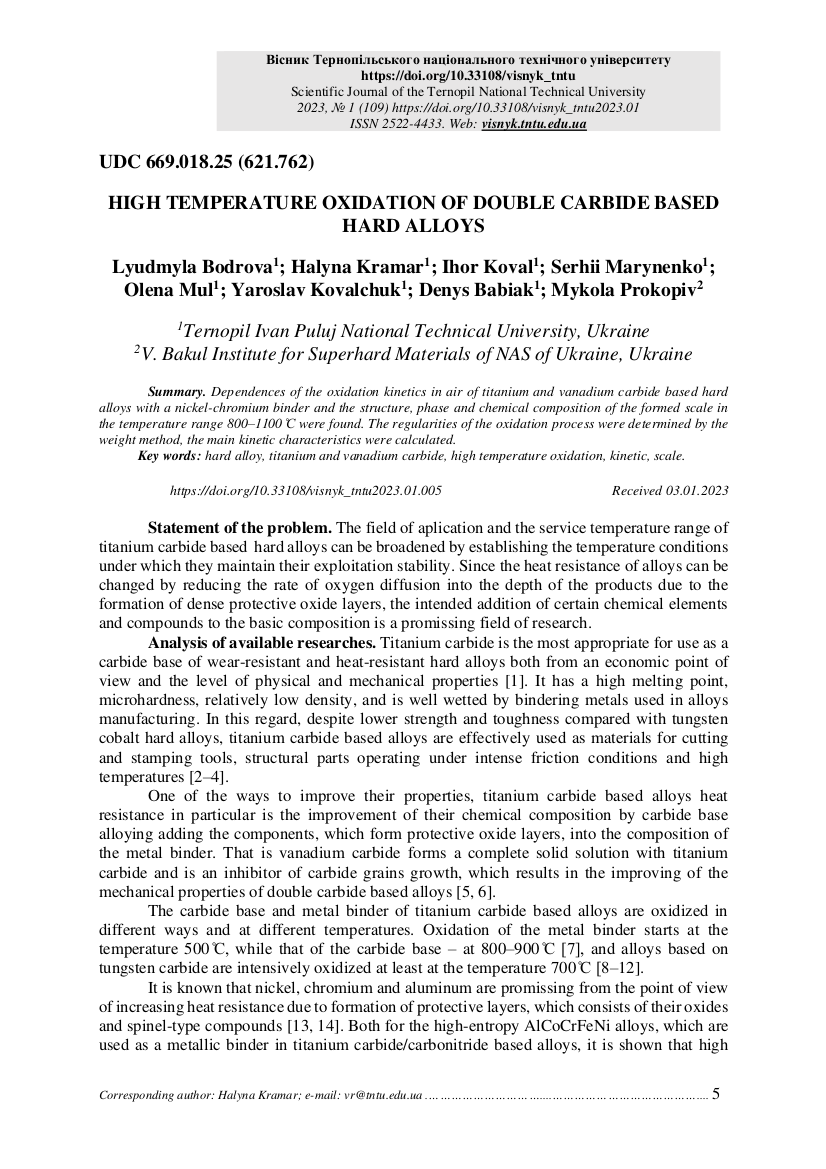 | Bibliographic description (Ukraine): | High temperature oxidation of double carbide based hard alloys / Lyudmyla Bodrova, Halyna Kramar, Ihor Koval, Serhii Marynenko, Olena Mul, Yaroslav Kovalchuk, Babiak Denys, Mykola Prokopiv // Scientific Journal of TNTU. — Tern. : TNTU, 2023. — Vol 109. — No 1. — P. 5–15. |