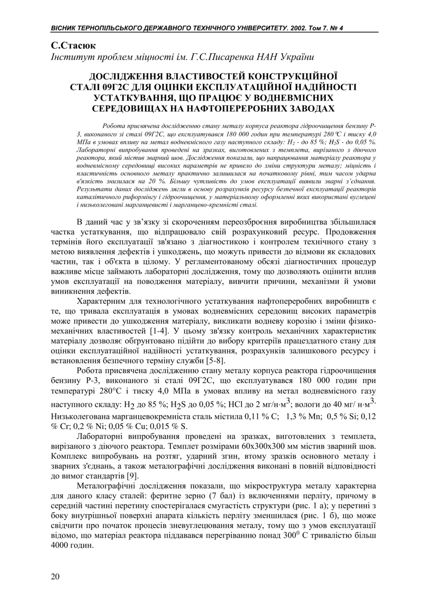 | Bibliographic description (Ukraine): | Стасюк С. Дослідження властивостей конструкційної сталі 09Г2С для оцінки експлуатаційної надійності устаткування, що працює у водневмісних середовищах на нафтопереробних заводах / Стасюк С. // Вісник ТДТУ. — Т. : ТДТУ, 2002. — Том 7. — № 4. — С. 20–24. — (Механіка та матеріалознавство). |