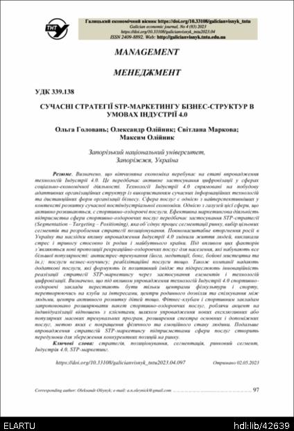 Бібліографічний опис: Сучасні стратегії STP-маркетингу бізнес-структур в умовах індустрії 4.0 / Ольга Олексіївна Головань, Олександр Миколайович Олійник, Світлана Вікторівна Маркова, Максим Олександрович Олійник // Галицький економічний вісник. — Т. : ТНТУ, 2023. — Том 83. — № 4. — С. 97–106. — (Менеджмент).