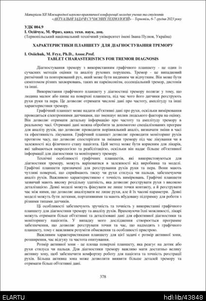 | Bibliographic description (International): | Osiichuk I., Fryz M. (2023) Kharakterystyky planshetu dlia diahnostuvannia tremoru [Tablet charasteristics for tremor diagnosis]. Book of abstracts of the ⅩⅡ International scientific and practical conference of young researchers and students „Actual problems of modern technologies“ (Tern., 6-7 December 2023), pp. 378-379 [in Ukrainian]. |