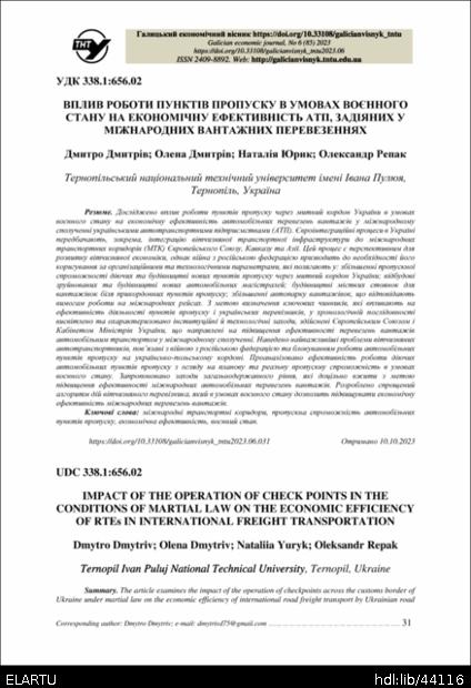 | Bibliographic description (International): | Dmytriv D., Dmytriv O., Yuryk N., Repak O. (2023) Vplyv roboty punktiv propusku v umovakh voiennoho stanu na ekonomichnu efektyvnist ATP, zadiianykh u mizhnarodnykh vantazhnykh perevezenniakh [Impact of the operation of check points in the conditions of martial law on the economic efficiency of RTEs in international freight transportation]. GEJ (Tern.), vol. 85, no 6, pp. 31-42 [in Ukrainian]. |