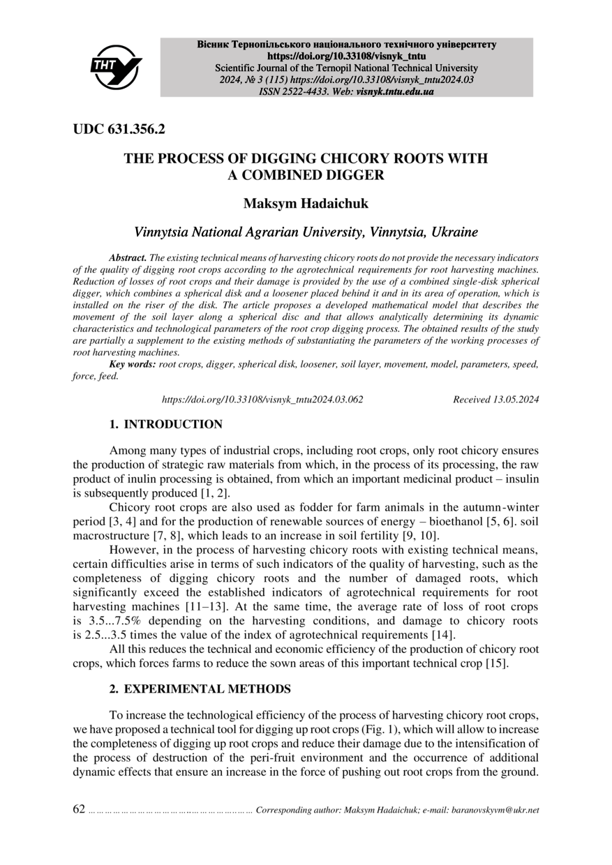 | Bibliographic description (Ukraine): | Hadaichuk M. The process of digging chicory roots with a combined digger / Maksym Hadaichuk // Scientific Journal of TNTU. — Tern. : TNTU, 2024. — Vol 115. — No 3. — P. 62–72. |